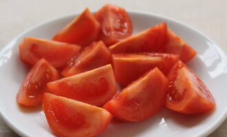 We wassen de tomaten, drogen ze en snijden het spoor uit de stengel. Snijd elke tomaat in dunne, gelijkmatige plakjes.