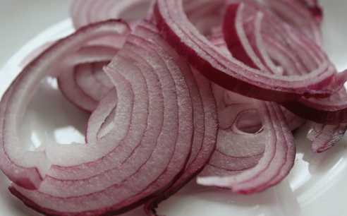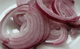 We raden het gebruik van de rode ui-variëteit aan, omdat deze veel zachter en delicater van smaak is. We reinigen het van de schil en snijden het in dunne doorschijnende ringen.