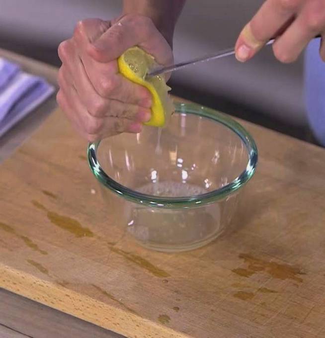 - We wassen de citroen met heet water om de afscheiding van sap te vergroten. Snijd de citrus doormidden en pers het sap van de ene helft in een kom. Verwijder de botten.