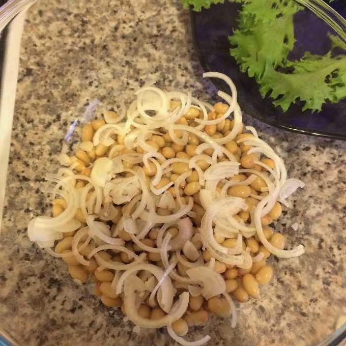 - We doen de bonen op een zeef en laten het sap uitlekken. Doe de bonen in een slakom. Schil de uien, snijd ze in dunne halve ringen en leg ze op de bonen.