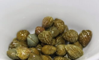 - Giet het overtollige vocht uit de tonijn en haal het vruchtvlees uit elkaar in kleine stukjes. We doen ze in de voorbereide dressing, voegen de kappertjes toe, mengen en laten vijf tot tien minuten staan zodat de vis verzadigd is met de aromatische vloeistof.