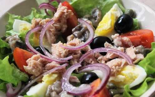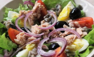 Leg de gewassen en gedroogde slablaadjes op geportioneerde borden of een gewone serveerschaal. Daarop leggen we afwisselend plakjes eieren en tomaten. We leggen er stukjes tonijn op. Leg er dan de olijven, kappertjes en rode uien op. Giet olijfolie over de salade en besprenkel met citroensap. Bestrooi met zout en zwarte peper. We serveren de salade direct na het koken op tafel, totdat de groenten hun versheid hebben verloren.