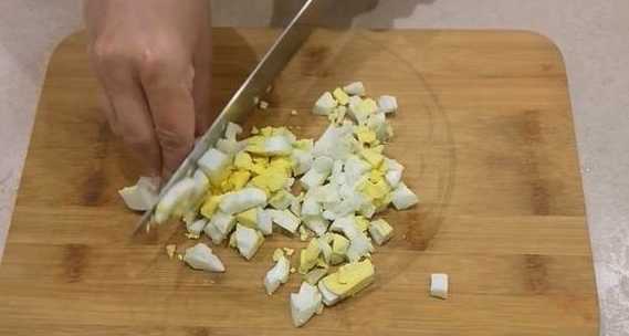 - Kook de eieren van tevoren en laat ze afkoelen. Schil en snij in kleine blokjes met een mes of eiersnijder.