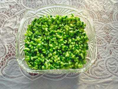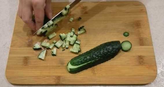 - We wassen de komkommer, drogen hem af met een handdoek en snijden de uiteinden aan beide kanten af. Als de groente oud is, snijden we de schil af en verwijderen we de grove zaden. Snijd de groente in kleine blokjes, vergelijkbaar met een ei.