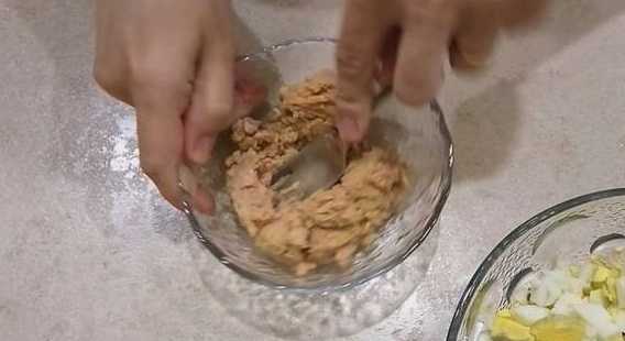 - Giet het vocht uit de tonijn en kneed het vruchtvlees met een vork. Meng de resulterende vismassa met de gehakte Peking.