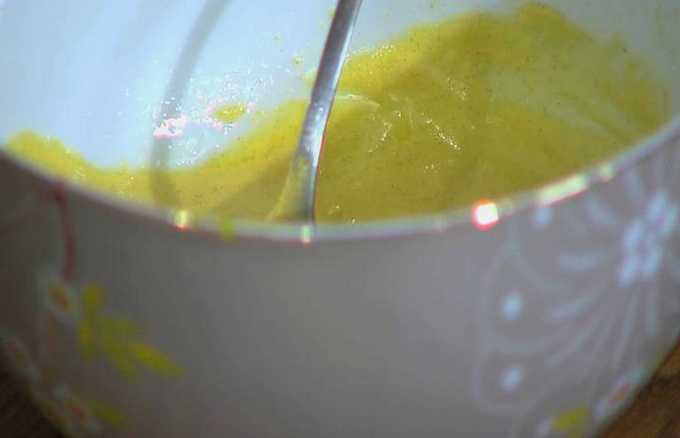 - Voeg mosterd en olijfolie toe aan het citroensap (2 eetlepels van het totaal). Roer tot een gladde massa.