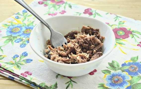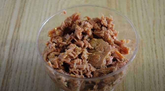 - Giet het vocht uit de tonijn en kneed het vruchtvlees met een vork. We leggen de resulterende massa op de bodem van een diepe slakom in een gelijkmatige laag.