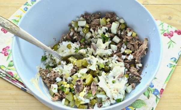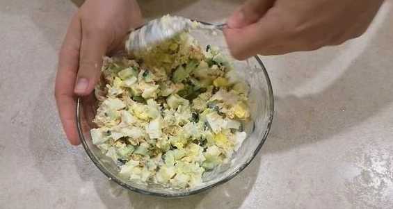 - Doe alle voorbereide ingrediënten in een slakom: gehakte eieren, stukjes komkommer en gepureerde tonijn. Voeg zwarte peper toe voor de smaak en zout het licht. Doe mayonaise in en meng.