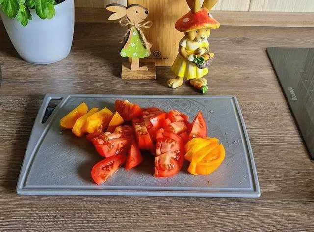 - Was en droog de tomaten en paprika's. Snijd het steeltje van de peper en verwijder de zaadjes. Snijd het vruchtvlees in kleine stukjes. Snijd de tomaten in dunne plakjes.