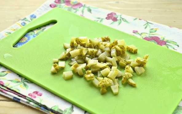 - Snijd de ingelegde komkommers in kleine blokjes. Als er tijdens het snijden veel sap vrijkomt, moeten we dit aftappen.