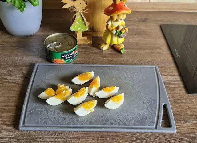 - Kook de eieren van tevoren en laat afkoelen. We maken schoon en snijden voorzichtig in longitudinale plakjes. We openen het blikje tonijn en laten het vocht weglopen. Kneed de vis met een vork.