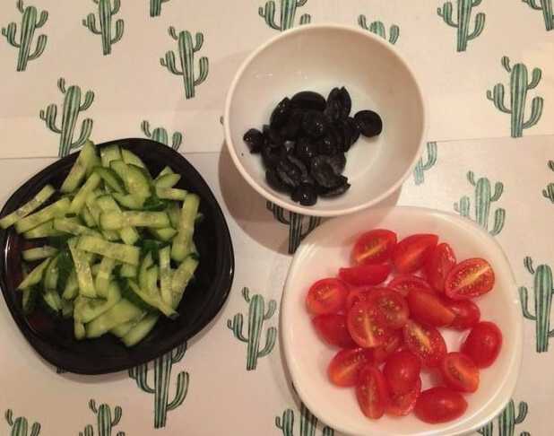 - Was en droog de cherrytomaatjes en komkommer. Snijd de tomaten in twee delen. Snijd de komkommer in dunne reepjes. Als de olijven ontpit zijn, snijd ze dan uit.
