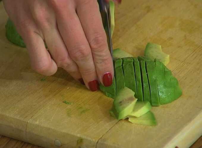 - We wassen en drogen de avocado. Verwijder het bot en snij de schil eraf. Snijd het vruchtvlees in kleine plakjes.