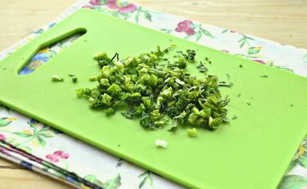 - Was groene uien en dille, droog en hak ze fijn met een mes.