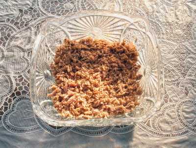 - We openen het blikje tonijn en laten het vocht weglopen. Kneed het vlees van de vis met een vork.