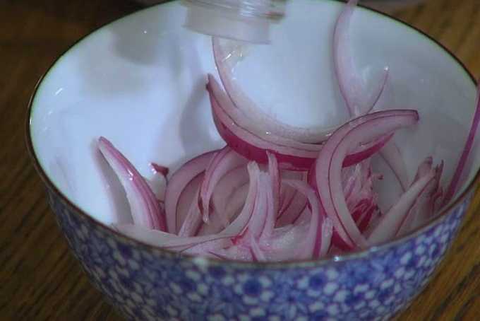 - Pel en snijd de rode ui in dunne halve ringen. We doen ze in een kom, vullen met appelciderazijn en marineren tien tot vijftien minuten, af en toe roeren.