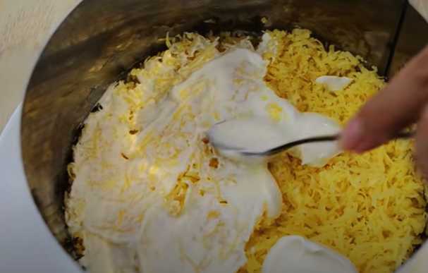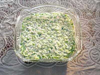 - Wrijf de gekookte eieren op een grove rasp en giet de volgende laag op de komkommers. Wij stemmen af.