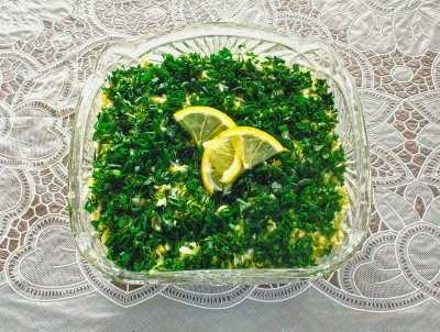 - Was de peterselie en groene uienveren en droog ze. Maal de voorbereide greens met een mes en verdeel de laatste laag over de eieren. Wij stemmen af. We versieren het oppervlak met een dunne snee citroen. Laat de afgewerkte salade een uur in de koelkast staan om de lagen te laten weken.