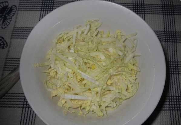 - Pekingkool wordt in bladeren gedemonteerd, gewassen en gedroogd. Snijd de verdikte gebieden af. Snijd de kool zo dun mogelijk. Plet de gehakte massa licht met je handen zodat er een beetje sap opvalt.