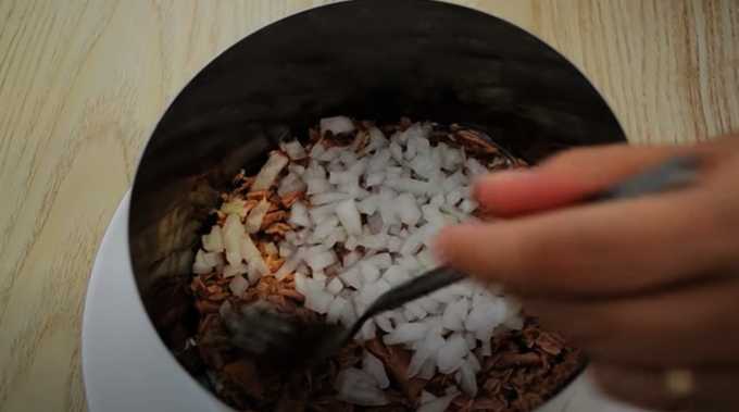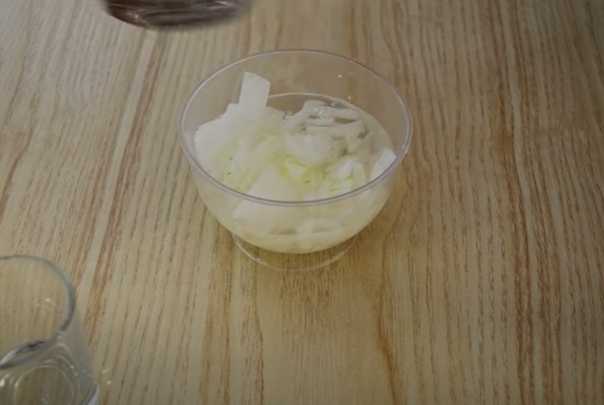 - Pel de uien. Snijd in kleine dwarse blokjes. We doen ze in een kom en vullen ze met appelciderazijn. Laat het vijf tot tien minuten marineren, giet dan de azijn af en pers de ui uit.