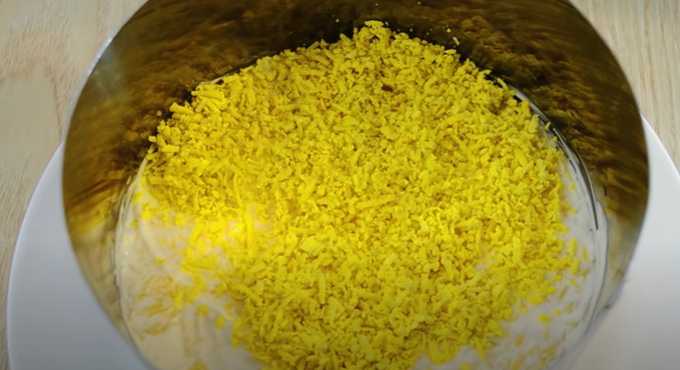 - De laatste laag is geraspte dooiers. Draai de ring vast met huishoudfolie en roer het gerecht met salade een paar uur in de koelkast om te weken.