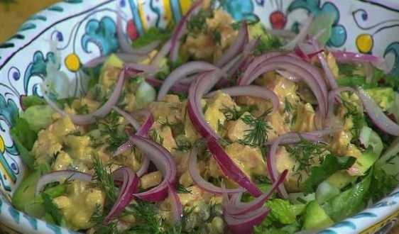 Tonijn en avocado zijn de perfecte combinatie zowel qua smaak als evenwichtige samenstelling. Op basis van deze combinatie maken we een salade. Voeg voor sappigheid en frisheid komkommers en een dressing op basis van citroensap toe. Neem voor pikant ingelegde rode uien en kappertjes. Traditioneel serveren we de salade op een "kussen" van verse kruiden.