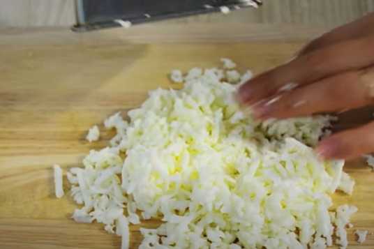- Snijd de gekookte eieren en haal de dooiers eruit. Wrijf het eiwit zonder dooiers op een grove rasp.