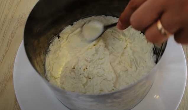 - Leg de culinaire ring op de bodem van de serveerschaal. We verspreiden de geraspte eiwitten erin en egaliseren het. Smeer met een dun laagje mayonaise.