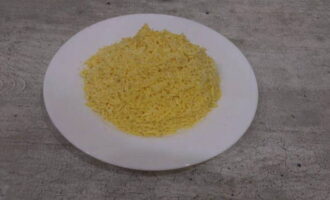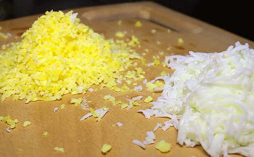 - Pel de gekookte eieren, scheid het eiwit en de dooiers en rasp elk deel in een aparte kom.