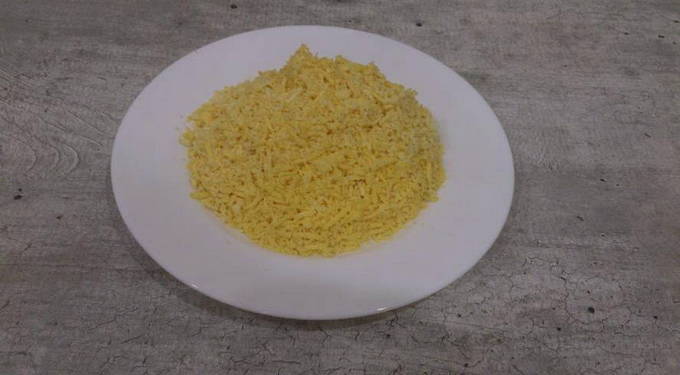 - Verdeel vervolgens het geraspte of fijngehakte ei en bedek met mayonaise.
