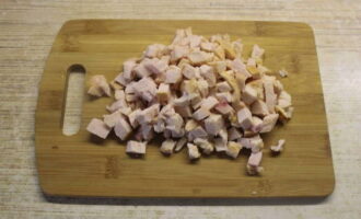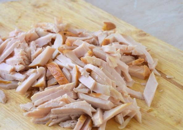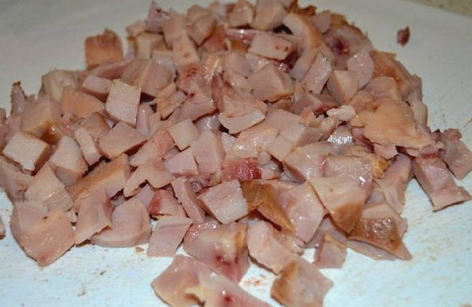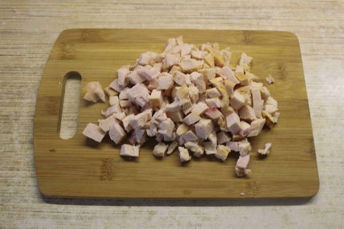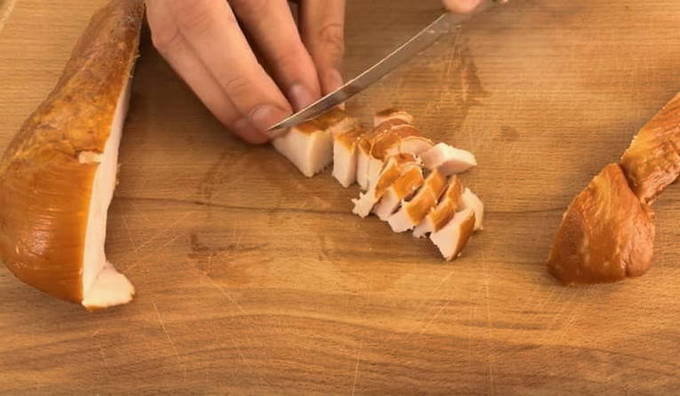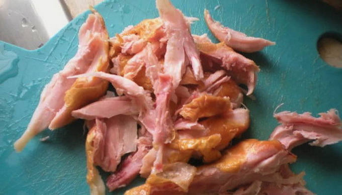 - Maak de gerookte kip los van vel en botten, snijd het vlees in blokjes of blokjes.