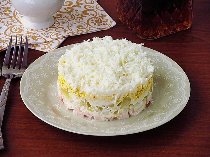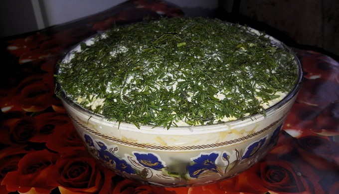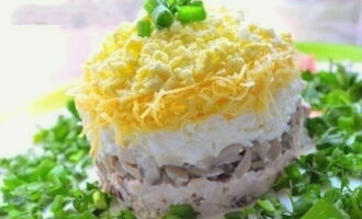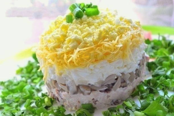 - Leg de ingrediënten in lagen in een slakom of ring (als de salade in porties wordt geserveerd): eerst de kip, dan de gehakte champignons, bedek ze met mayonaise, doe dan geraspte eiwitten, een laag mayonaise, kaas, nog een laag mayonaise en verdeel er een laag gehakte dooiers over. Laat het gerecht minimaal 15 minuten intrekken, garneer met kruiden en serveer.