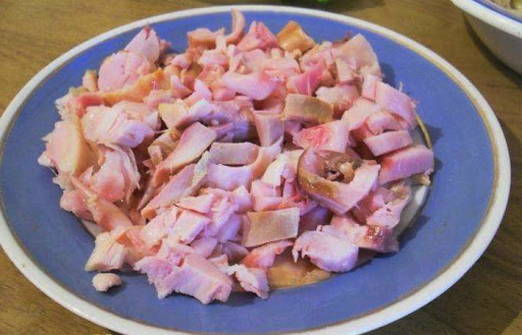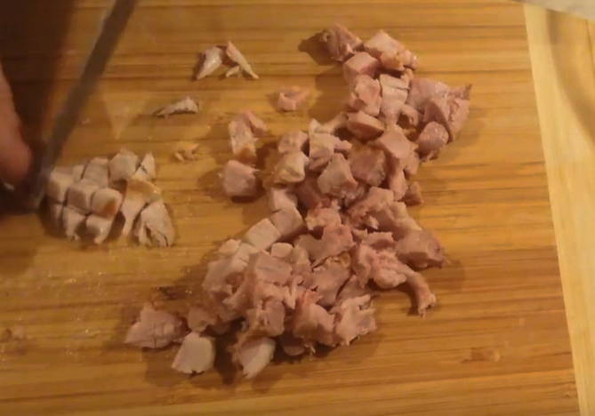 - Haal het vlees van de poot, de kippenhuid wordt niet gebruikt voor de salade. Het vlees wordt in kleine blokjes gesneden.