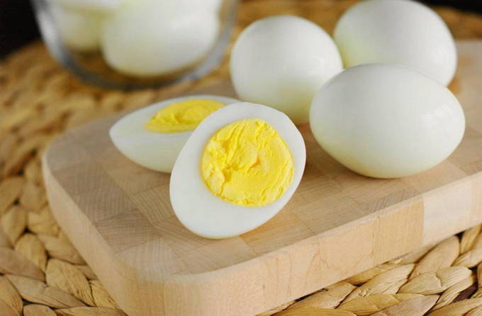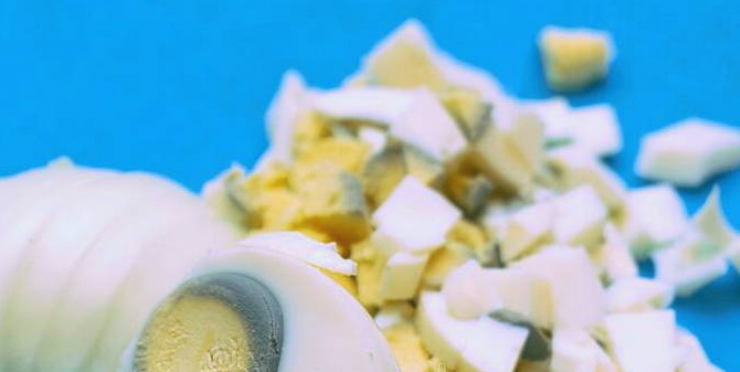 - Kook de eieren, scheid het wit en de dooier, hak ze apart.