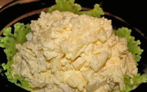 - Leg de salade in lagen op een schaal of in een geportioneerd bord: eerst de aardappelen, die voorzichtig bedekt zijn met een dun laagje mayonaise, dan de kip - herhaal de procedure met mayonaise na elke laag. Leg dan de ui, dan de fijngehakte dooier, gesmolten kaas en bedek de salade met een laagje kippeneiwit. Om het gerecht sappiger en smakelijker te maken, laat u de salade ongeveer een uur trekken. Genieten van!