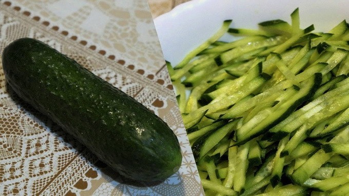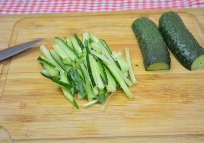 Haal het kippenvlees van het bot en snijd het op dezelfde manier als bij komkommers.