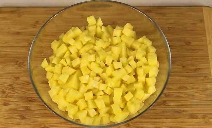 - Schil de aardappelen en wortelen gekookt in gezouten water. Snijd de groenten in kleine, gelijkmatige, mooie blokjes.