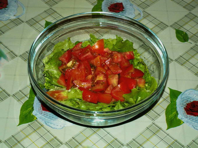 - Snijd de steel van tomaten en hak ze in kleine plakjes of blokjes, evenredig aan de kip.