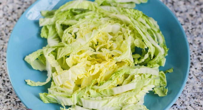 - Maak de Chinese kool los van bedorven of gekreukte bladeren, hak ze fijn en doe ze in een kom.