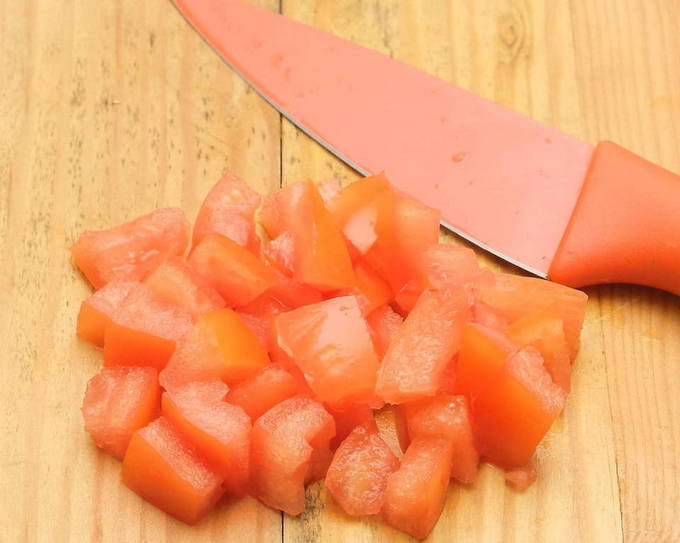 - Snijd de tomaten in blokjes, na het verwijderen van de steel.