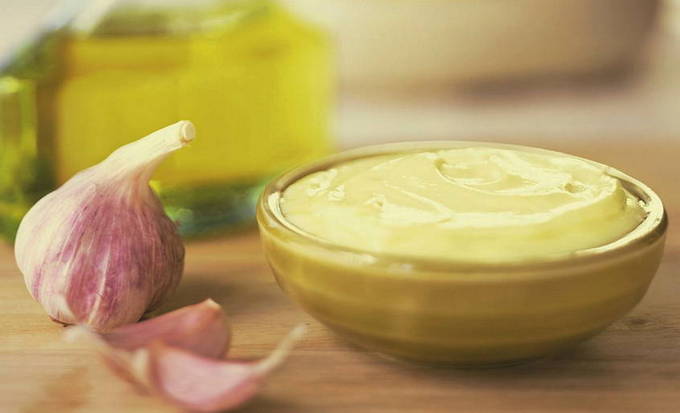- Haal de knoflook door een pers en meng met zout en zure room.
