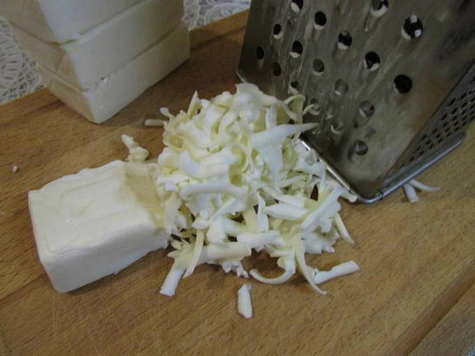 - Snijd de smeltkaas in hele kleine blokjes of rasp. U kunt het een beetje voorvriezen om het maalproces gemakkelijker te maken.