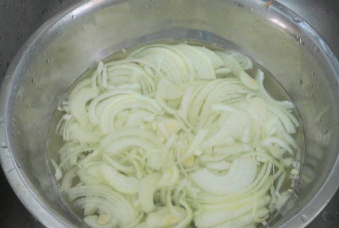 - Snijd de gepelde ui in halve ringen en blancheer om de bitterheid te verwijderen, giet er een minuut kokend water over.