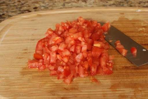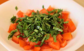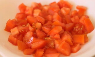 We wassen de tomaten onder koud water, snijden ze in blokjes en doen ze in een kleine slakom. Voor de salade is het aan te raden stevige en niet te sappige groenten te gebruiken zodat er geen overtollig vocht in het gerecht komt.