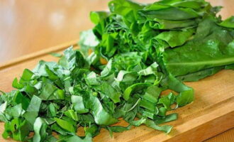 We wassen de verse zuring, laten hem drogen en hakken hem vervolgens met een mes.