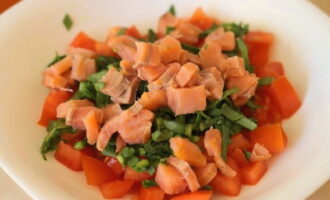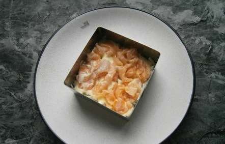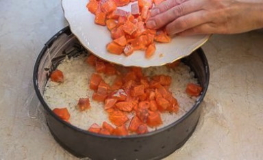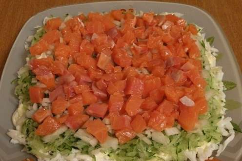 - Snijd de rode vis fijn en leg deze ook in een laag. Een klein stukje kan worden overgelaten voor decoratie.