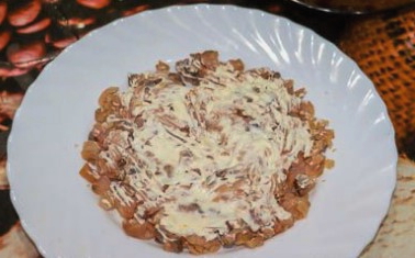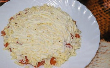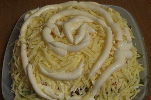 - Wrijf harde kaas op een grove rasp. We verdelen het over de salade en bestrijken het opnieuw met mayonaise.