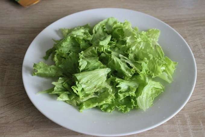 - We wassen de slablaadjes, laten ze drogen en scheuren ze met onze handen in kleine stukjes. Plaats het product op de bodem van een plat bord.