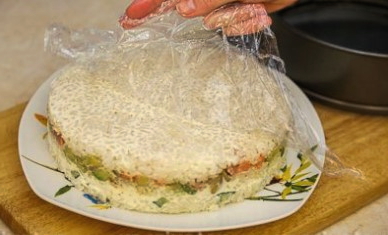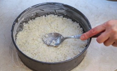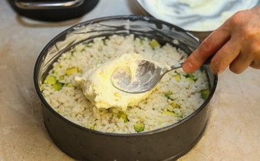 - Leg een derde van de afgewerkte rijst op de bodem van de diepe uitneembare vorm. Druk de laag plat met een lepel.