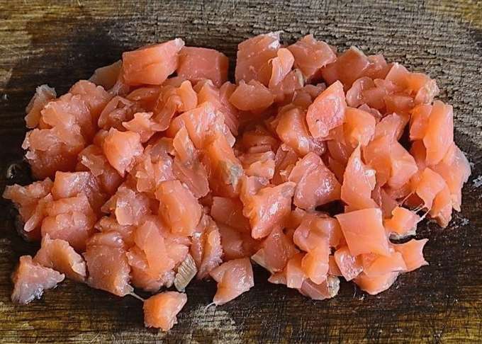 - We kiezen rood gezouten vis naar smaak. Daarna snijden we het in kleine blokjes.